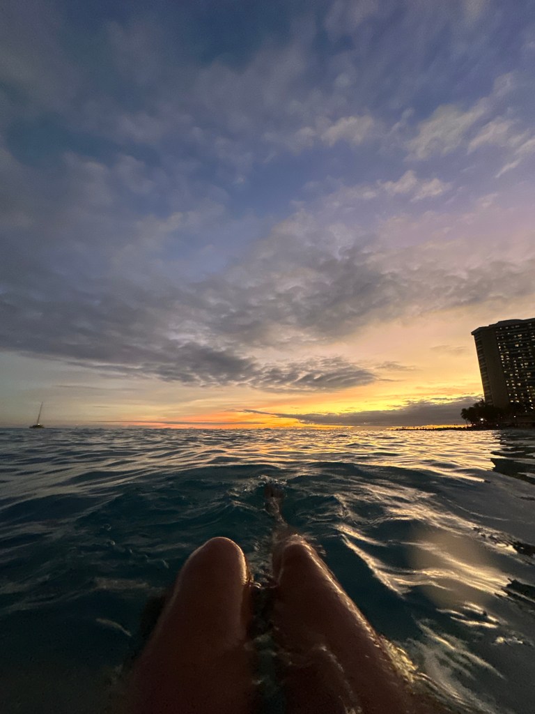 The sun’s first light begins to sneak up behind Diamond Head. Not a soul to be seen on land, only a handful of surfers patiently waiting off shore. There is peace and only the sound of the waves breaking gently, turning their aqua blue body into frothy secrets, tickling the sand at their fringe before slipping away again. When the sun finally reaches over the jewel necklace, it turns the water to liquid silver before the full glory of its aqua blue. Baby Honu and her sisters play close to shore. By noon the ocean will change her color once again – a brilliant turquoise to the backdrop of music and the laughter of a hundred. The endless edge of the horizon moves me out of myself and I transcend the chaos. Floating here at sunset is one of my favorite things in the world to do. The crowd transitions from the water to the beach endeavoring to capture that perfect sunset photograph. From my position as flotsam, it is a vision of liquid gold, and the water’s touch is soft and sensual, slipping gently at my edges. Like making love with the sunset, the ocean – cradled in pure bliss.